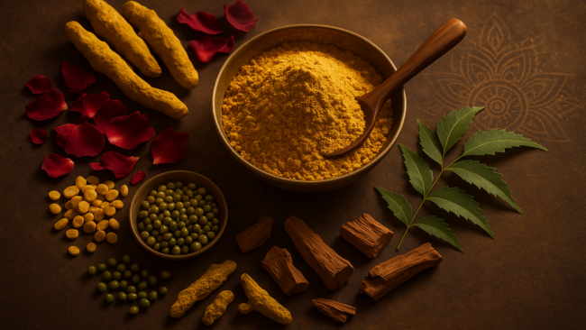 Every ubtan is made from hand-processed ingredients like green gram, chana dal, neem, multani mitti, and rose — with no artificial fragrance, colour, or synthetics.